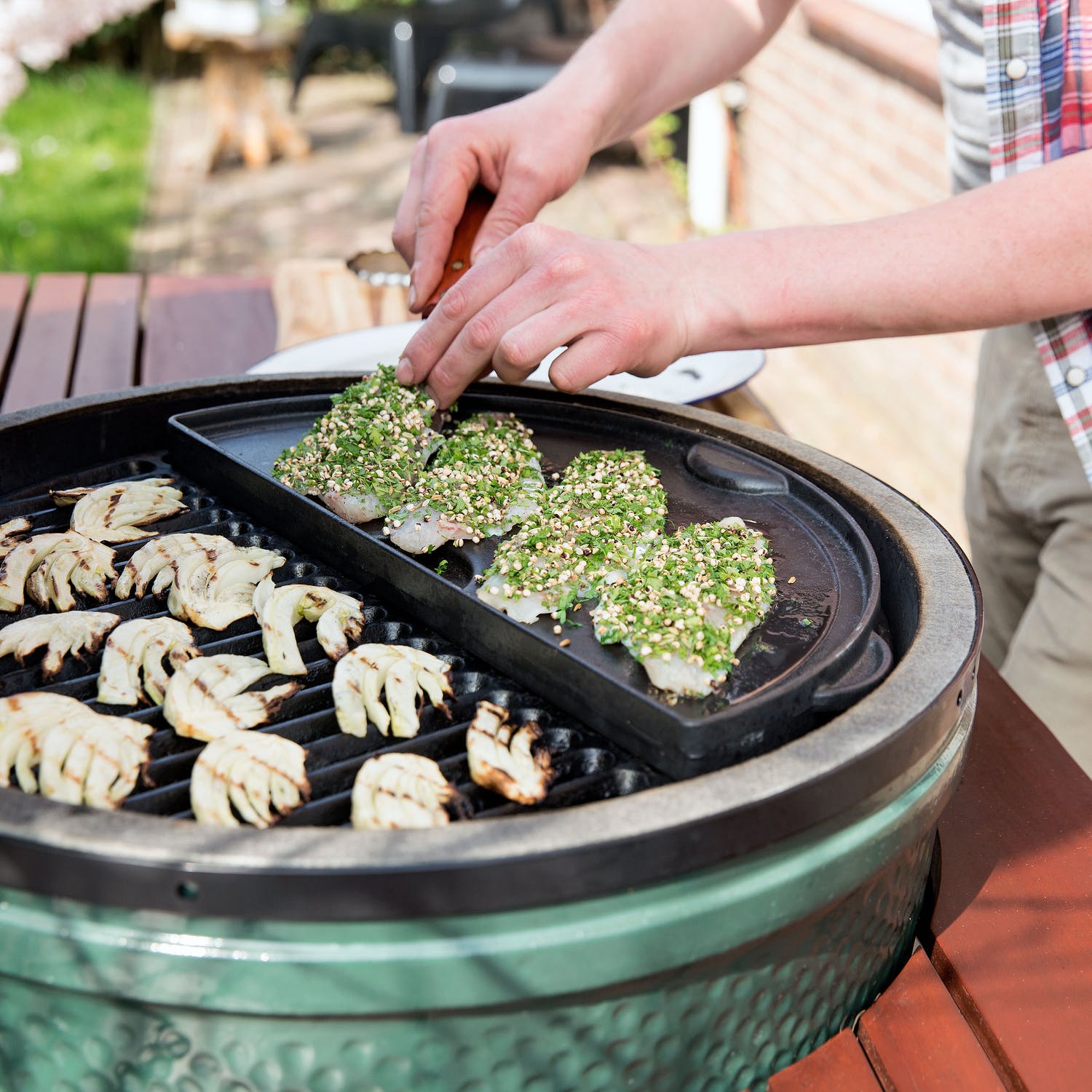 Big Green Egg 116406 - эта полезная чугунная сковорода многофункциональна, поскольку имеет как рельефную, так и гладкую стороны. Гладкая сторона идеальна для приготовления тонких блинчиков или яичницы, а рельефная сторона замечательно подойдет для тостов, сэндвичей и нежного филе рыбы. Поскольку чугунная полукруглая сковорода занимает только половину пространства, Вы можете одновременно готовить другие блюда. Всего половина рабочей поверхности, а вкус на все сто. Совместима с грилем Big Green Egg XLarge 117649, и для других Камадо и кетл грилей диаметром решетки 61 см.
