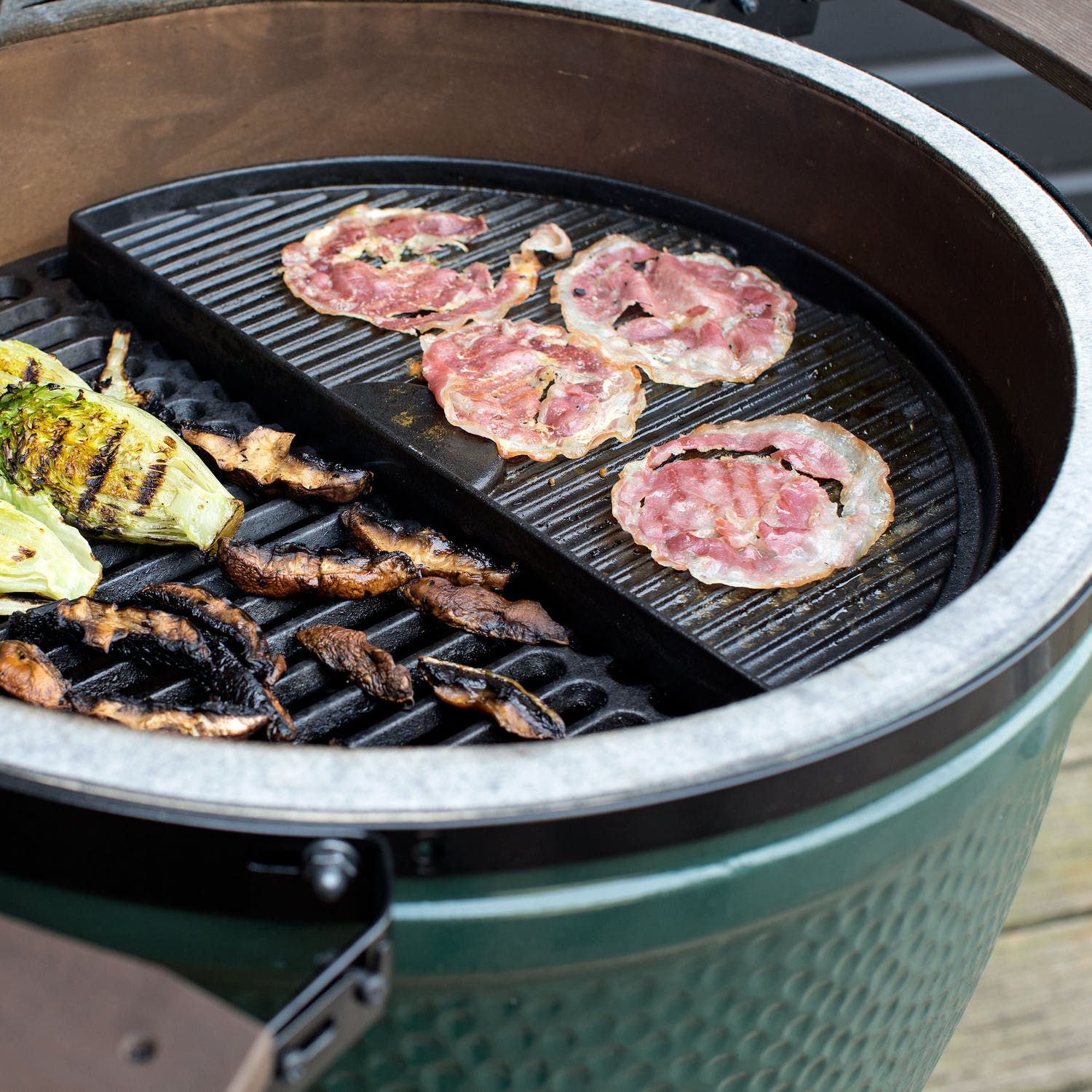 Big Green Egg 104090 - эта полезная чугунная сковорода многофункциональна, поскольку имеет как рельефную, так и гладкую стороны. Гладкая сторона идеальна для приготовления тонких блинчиков или яичницы, а рельефная сторона замечательно подойдет для тостов, сэндвичей и нежного филе рыбы. Поскольку чугунная полукруглая сковорода занимает только половину пространства, Вы можете одновременно готовить другие блюда. Всего половина рабочей поверхности, а вкус на все сто. Совместима с грилем Big Green Egg Large 117632, и другими Камадо диаметром решетки до 46 см.