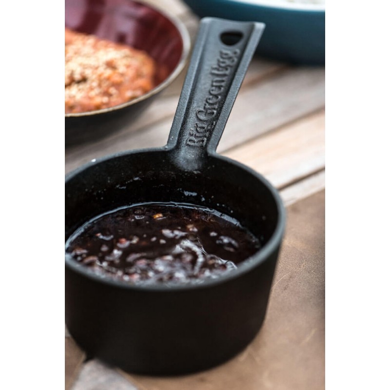 Сотейник чугунный с ручкой, силиконовой кисточкой для соусов и маринадов Big Green Egg 117663, идеально подходит для растапливания масла, нагрева соусов и маринадов. Удерживает тепло после снятия с печи. Силиконовая кисточка для смазывания полностью помещается в ручку сотейника, так что Вы можете не волноваться о чистоте своей скатерти. Снимите кисточку, если собираетесь ставить чугунный сотейник в EGG.
