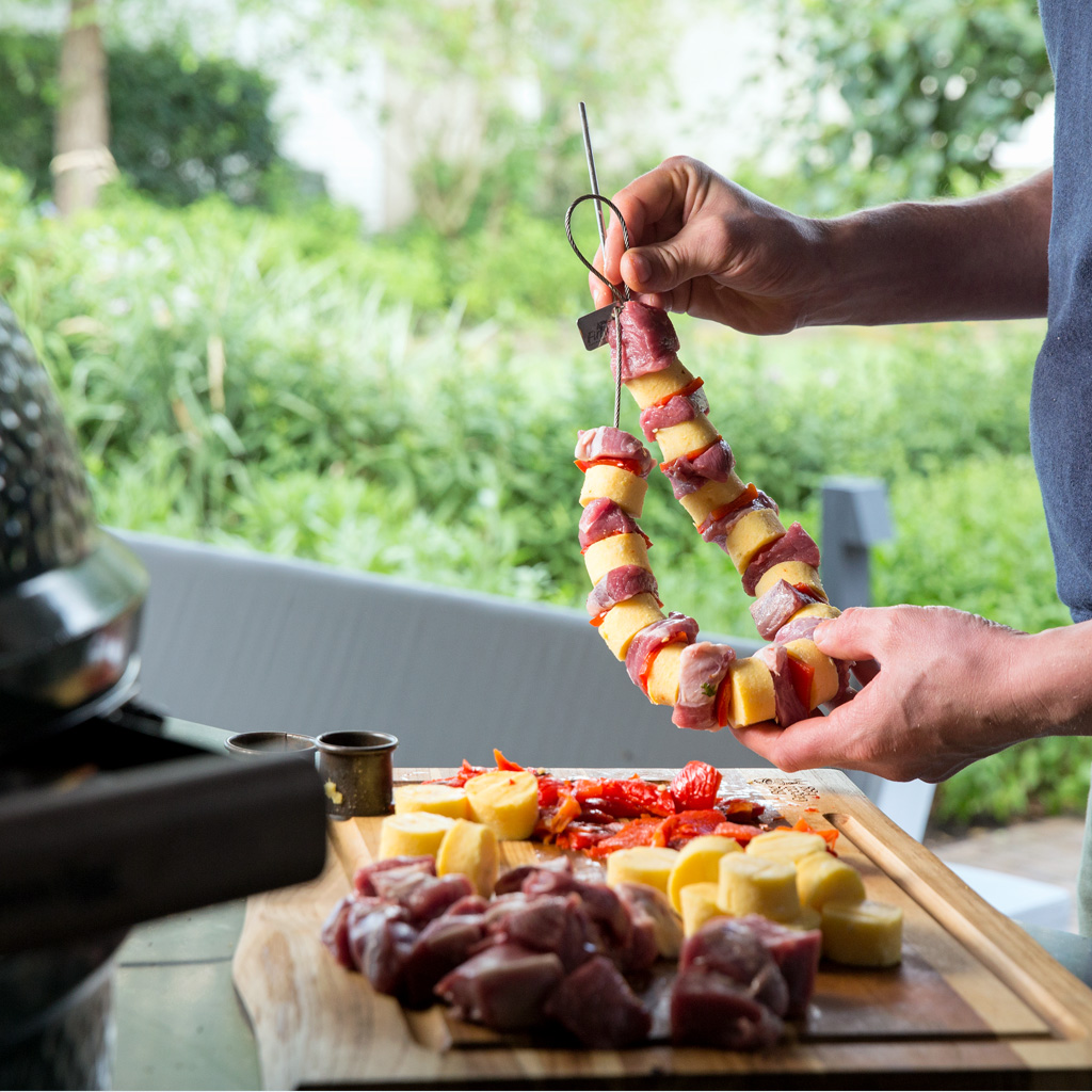 Благодаря гибким шампурам BigGreenEgg® 201348. приготовление шашлыка покажется Вам увлекательной игрой. Вы мгновенно сможете нанизать на него кусочки мяса, рыбы, птицы и овощей, не боясь, что они соскользнут. Закончили? Теперь Вы снова можете окунуть шашлык на гибких шампурах в маринад, чтобы он получился еще более сочным. Из-за своей гибкости, могут использоваться в любом гриле.