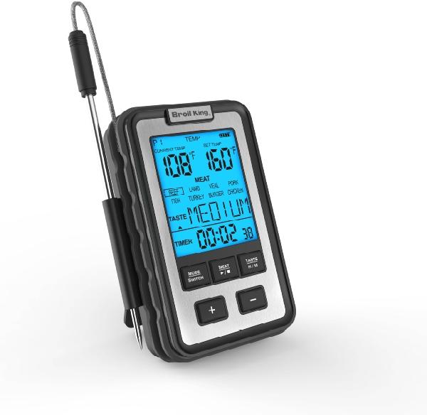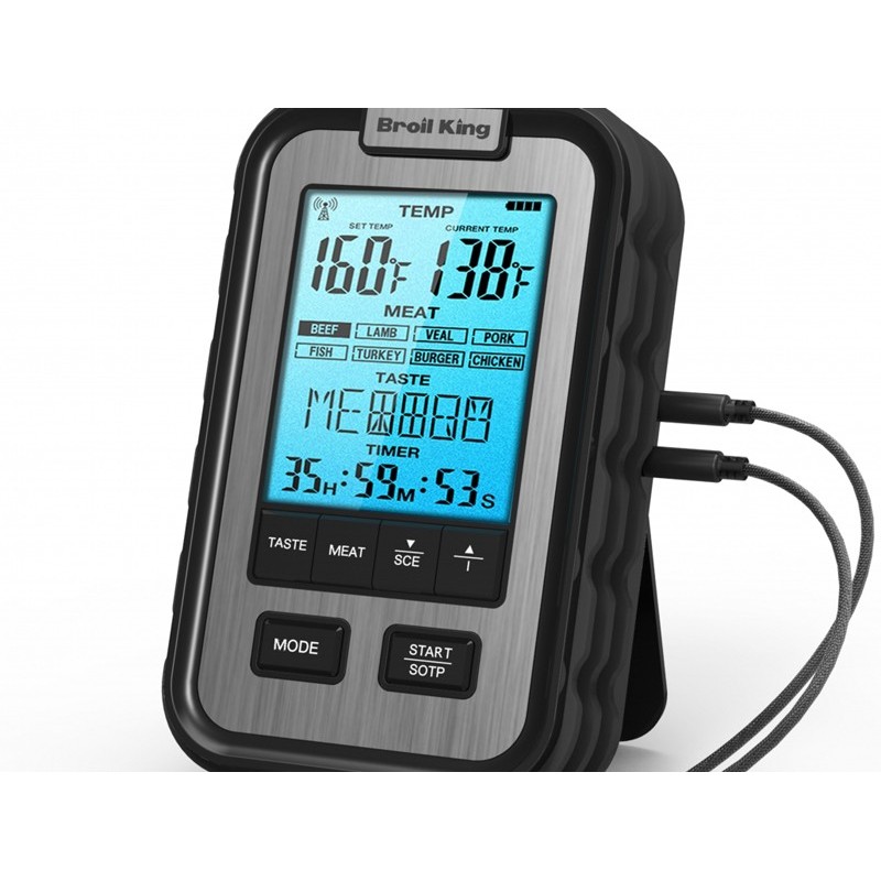 Настольный цифровой термометр Broil King 61935 защищён от воздействия дождя и пыли. Термометр удобно крепится на боковой полке гриля и позволит максимально точно определить температуру продукта. Термометр отображает время и данные по приготовлению продуктов. С термометром Broil King® не придется каждый раз прокалывать мясо, выпуская из него ценный сок что непременно скажется на вкусовых качествах приготовленного блюда. В комплекте идут два щупа.