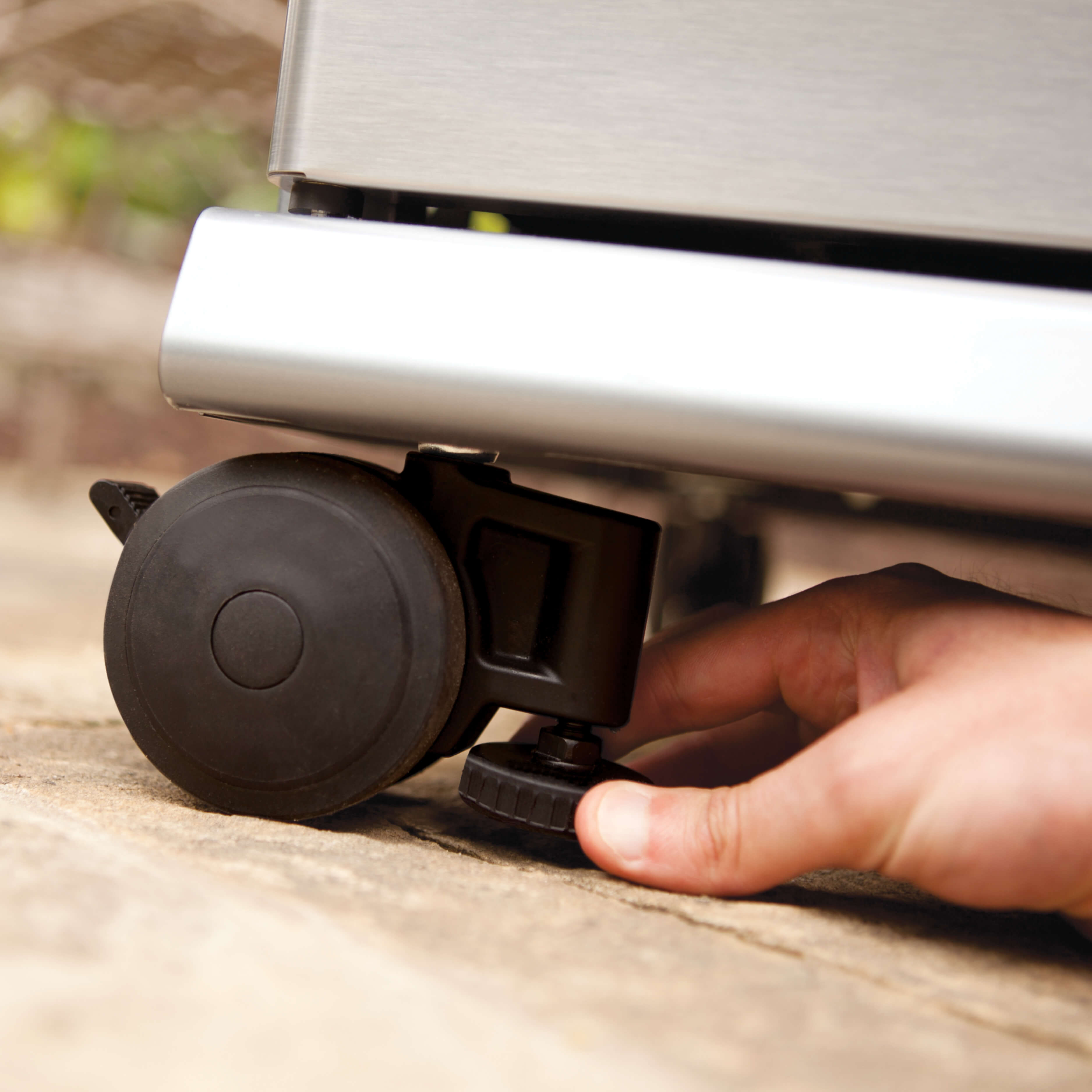 Крупные прорезиненные колеса позволяют с легкость перемещать гриль по патио или саду.
