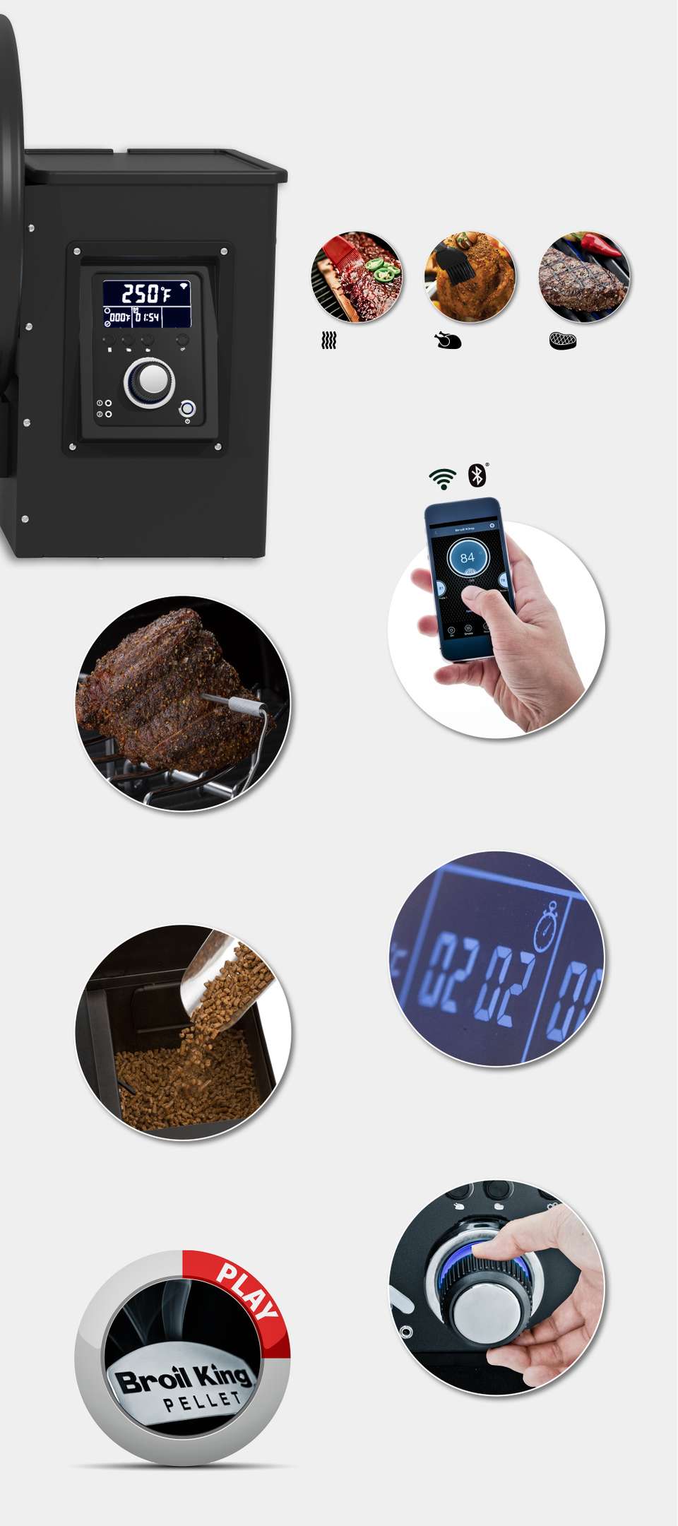Пеллетный гриль Broil King Smoke Pellet 400 Pro — это интеллектуальное устройство на основе цифровой консоли, с поддержкой Wi-Fi и Bluetooth, которая управляет подачей пеллет и работой свечи зажигания. Весь процесс Вы контролируете на своём смартфоне. Достаточно лишь установить требуемую температуру, и система с мотором, механизмом подачи и датчиками обеспечивает необходимый уровень топлива и поджига. Если нужно коптить, то топлива будет мало, а поджиг обеспечит режим, при котором топливо будет тлеть. Если же требуется сильный жар, то пеллет в камеру поступит много, и они будут гореть пламенем. Сбоку у гриля есть специальный контейнер для пищевых древесных гранул – пеллет, он рассчитан на 8 кг. Этого количества хватает на длительную работу гриля (до нескольких часов). Вы наполняете контейнер пеллетами, включаете гриль, выставляете нужную температуру. Шнек соединяет загрузочную воронку с горелкой, расположенной под решеткой, и, вращаясь, перемещает гранулы. С помощью так называемого «горячего стержня» пеллеты загораются, попадая в горелку. Поскольку компьютер контролирует работу вентилятора, Вам нет необходимости находиться рядом, чтобы следить за температурой. После использования пеллетный гриль, как и угольный, необходимо чистить.