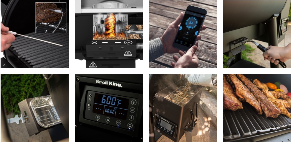Пеллетный гриль Broil King 493055 Smoke Pellet Crown 400 — это интеллектуальное устройство на основе цифровой консоли, с поддержкой Wi-Fi и Bluetooth, которая управляет подачей пеллет и работой свечи зажигания. Весь процесс Вы контролируете на своём смартфоне. Достаточно лишь установить требуемую температуру, и система с мотором, механизмом подачи и датчиками обеспечивает необходимый уровень топлива и поджига. Если нужно коптить, то топлива будет мало, а поджиг обеспечит режим, при котором топливо будет тлеть. Если же требуется сильный жар, то пеллет в камеру поступит много, и они будут гореть пламенем. Сбоку у гриля есть специальный контейнер для пищевых древесных гранул – пеллет, он рассчитан на 8 кг. Этого количества хватает на длительную работу гриля (до нескольких часов). Вы наполняете контейнер пеллетами, включаете гриль, выставляете нужную температуру. Шнек соединяет загрузочную воронку с горелкой, расположенной под решеткой, и, вращаясь, перемещает гранулы. С помощью так называемого «горячего стержня» пеллеты загораются, попадая в горелку. Поскольку компьютер контролирует работу вентилятора, Вам нет необходимости находиться рядом, чтобы следить за температурой. После использования пеллетный гриль, как и угольный, необходимо чистить.