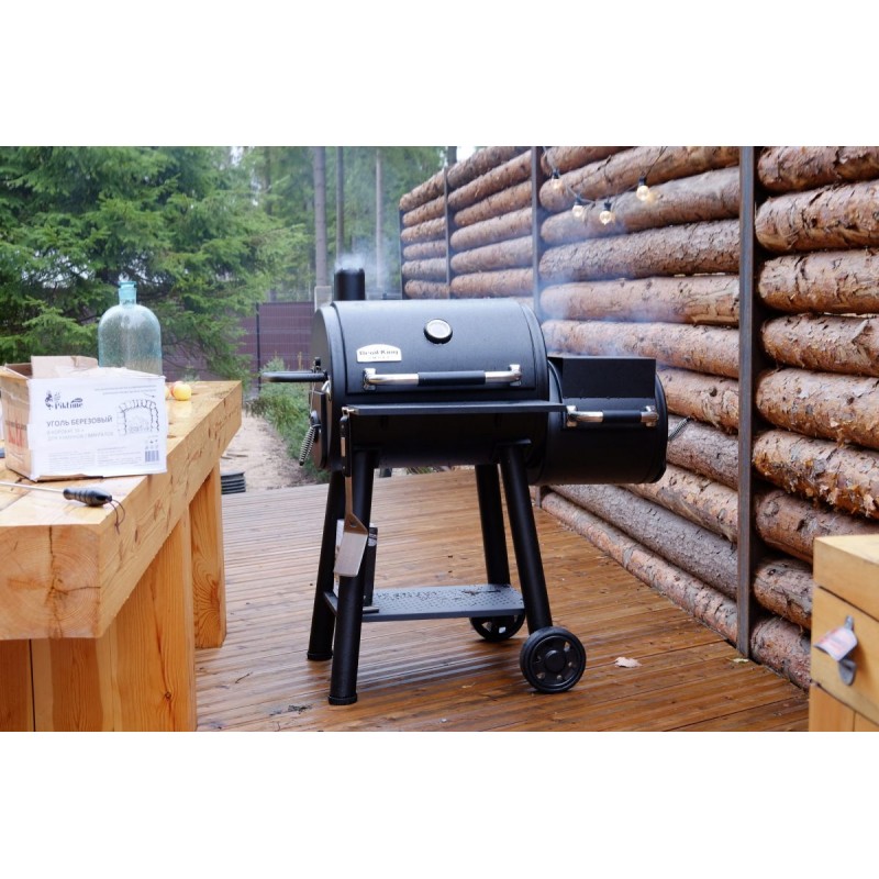 Внутри основной камеры находится большая чугунная двусторонняя решетка 65х49 см. В малой камере находится удобный зольник. Вентили для регулировки температуры выполнены из жаропрочного чугуна. Гриль имеет большие колеса, современную фурнитуру и удобную полку с крючками для инструментов.