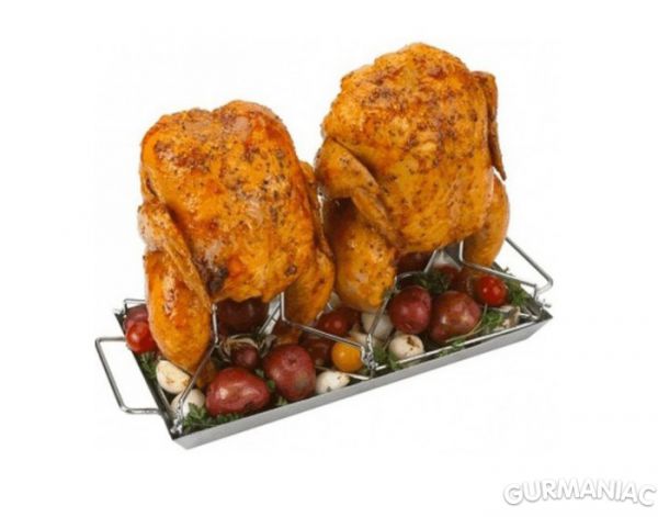 Этот набор Grillpro 41442, включает в себя противень из нержавеющей стали и две подставки для птицы, которые складывается для удобства хранения. Держатель для курицы Grillpro 41442 – классический американский аксессуар, с помощью которого Вы готовите курицу над открытой, наполненной до половины банкой пива. В процессе жарки пиво закипает, и его пары придают курице дополнительную нежность и сочность. Звучит сложно? Только не с нашим держателем для курицы! Держатель из металлической проволоки, надежно удерживает банку с пивом и защищает ее от опрокидывания. С помощью этого аксессуара, очень просто приготовить сразу две, идеально зажаренные птицы. Сок остается внутри, так как мясо птицы увлажняется ее собственным жиром, благодаря вертикальному положению, усиливая аромат и превращая кожу в хрустящую корочку. Для предотвращения попадания жира на гриль, имеется поддон для сбора капель. Так же в противень можно налить любимое пиво, или что то ещё… Можно мыть в посудомоечной машине, складывается и не занимает много места при хранении.