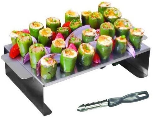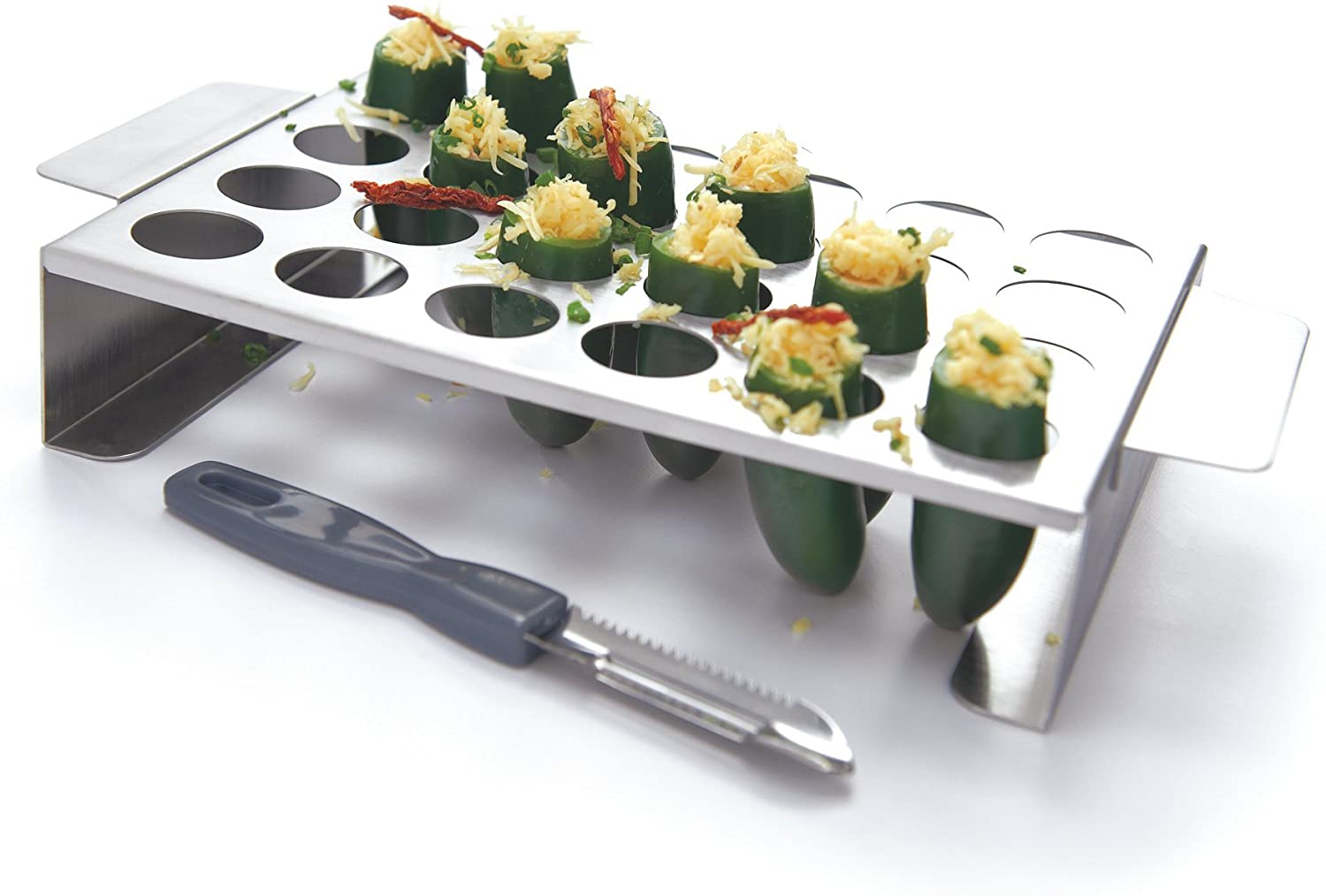 Для фаршировки, жарки и приготовления перцев халапеньо или итальянского сладкого перца необходимо удалить сердцевину и разместить овощи вертикально, чтобы сок не вытекал. С помощью набора для перца Grillpro 41555, из подставки для перца и ножа для удаления сердцевины, сделанных из нержавеющей стали, можно легко удалить семена и перегородки, нафаршировать перцы и приготовить их целиком. Подставка рассчитана на 24 перца.