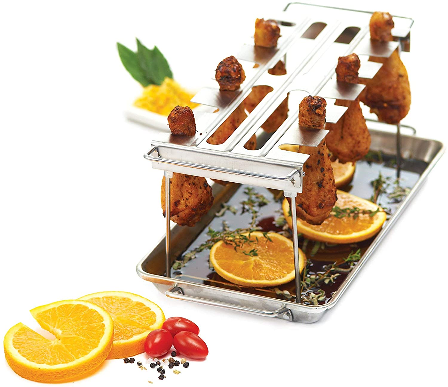 Этот набор Grillpro 41552, включает в себя противень из нержавеющей стали и подставку для крылышек, которая складывается для удобства хранения. Эта подставка из нержавеющей стали позволит Вам удобно разместить куриные крылышки, бёдрышки, ножки и т.д., не кладя их на поверхность гриля. Благодаря этому, крылышки не будут прилипать к решеткам, а противень не даст им воспламениться. Так же в противень можно налить любимое пиво, или что то ещё…