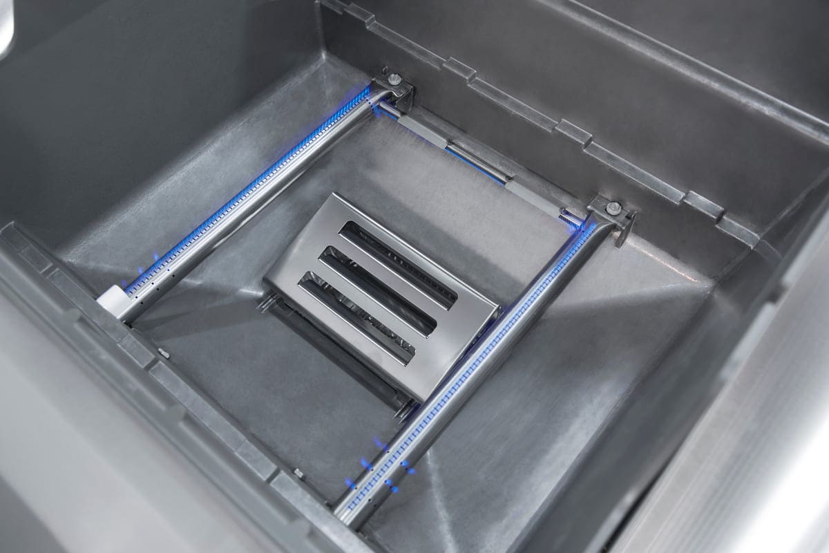 Две газовые горелки с оптимальным распределением жара общей мощностью 7,9 кВт и удобные бесступенчатые регуляторы подачи газа для получения оптимальных результатов при прямом и косвенном методе приготовления.