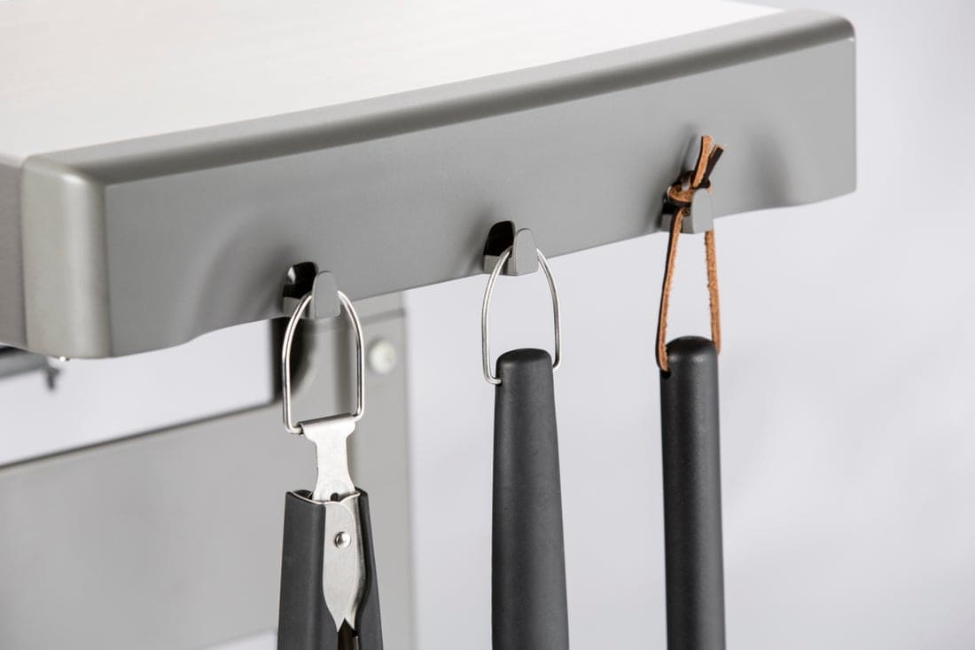 Прочные боковые столики, оборудованы крючками для инструментов. Боковые полки изготовлены из нержавеющей стали легко и быстро складываются для компактного хранения гриля.