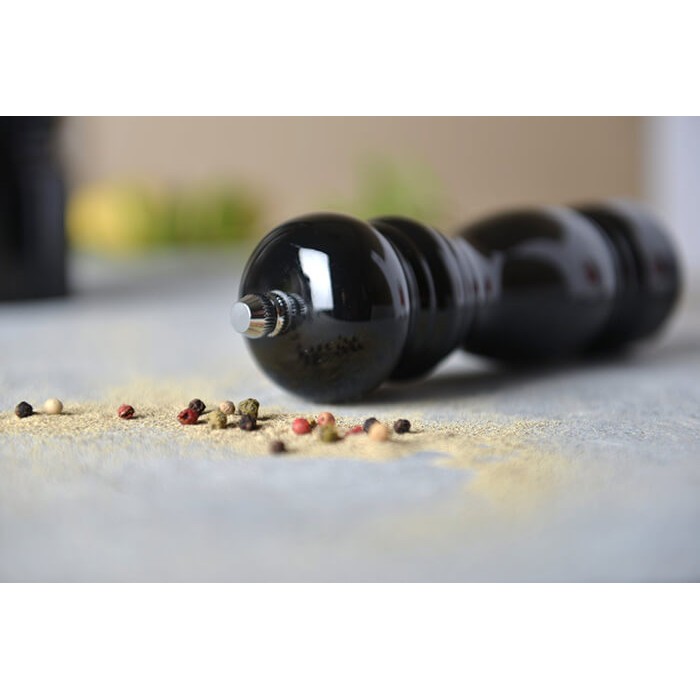 Механічний млин виготовлений з дерева та покритий чорною глянсевою фарбою. Має зручну форму та добре лежить у руці, тому під час використання не зісковзують. Робочий механізм млина виконаний з кераміки, що гарантує тривалий термін служби жорнів та рівномірний помел. При використанні є можливість регулювати ступінь помелу та необхідну дозу прянощі. У ручних млинах шляхом ослаблення та затягування гвинта на дні перцемолки можна підібрати ступінь помелу для ваших страв.
