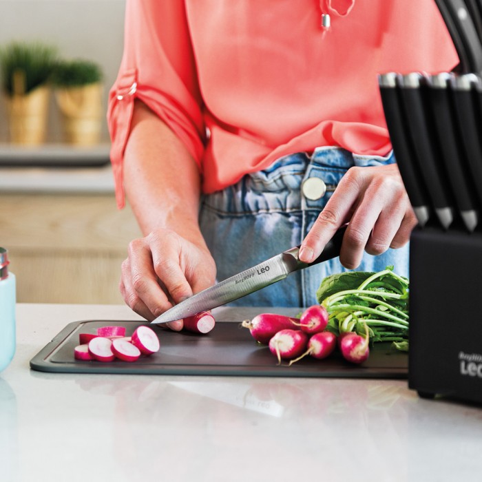 Кухонне приладдя може багато в чому полегшити господаркам приготування їжі. Одним з таких кухонних аксесуарів є універсальний кухонний ніж BergHOFF® 3950355, маючи лезо довжиною 12 см. дуже практичний, так як він підходить і для м'яса і для овочів. Такий ніж легкий у роботі і не потребує особливих навичок. Даний універсальний ніж виготовлений з високоякісної нержавіючої сталі X50CrMoV15, яка не схильна до корозії протягом довгих років.