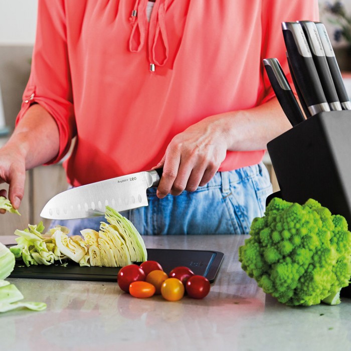 Универсальный нож для кухни BergHOFF® 3950357, альтернатива шеф-ножу. Благодаря воздушным капсулам вдоль лезвия продукты не прилипают к поверхности ножа. Японским ножом Сантоку резать легче и быстрее.