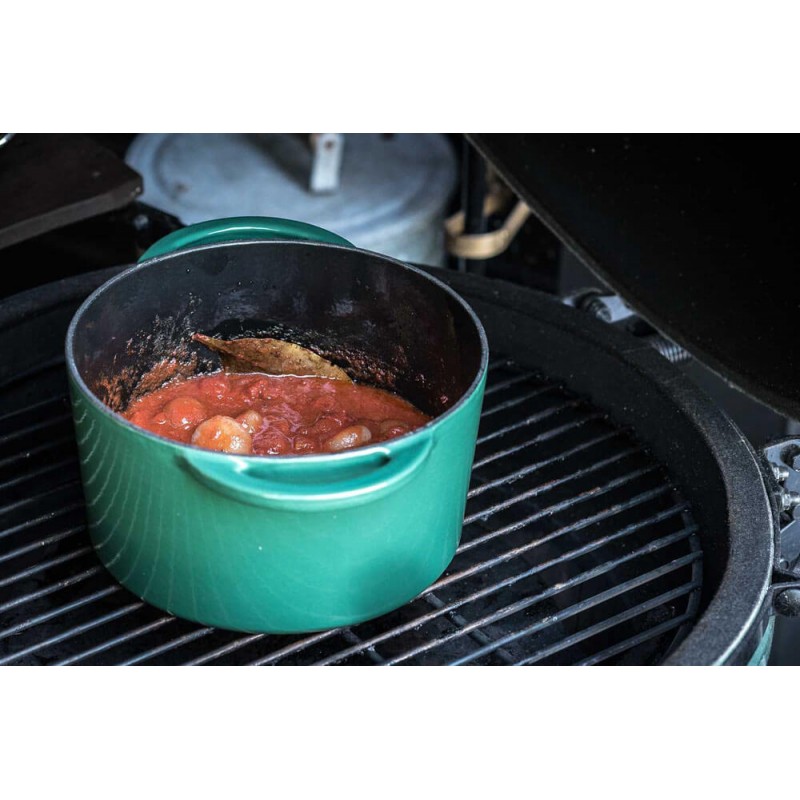 Унікальна чавунна жаровня Big Green Egg 117045, чудова своєю функціональністю, довговічністю та практичністю. Вона сконструйована таким чином, що кришка може використовуватися окремо, і може бути неглибокою сковородою, або навіть як форма для тортів і десертів. Це дозволяє не тільки запікати, смажити і гасити, але й готувати смачний суп, каррі і навіть страви на сковороді. Зелену голландську духовку дуже легко чистити, крім того, вона забезпечує постійне прожарювання завдяки здатності чавуну утримувати та рівномірно розподіляти тепло. Багатофункціональна, практична та надійна чавунна духовка дозволяє розкритися кулінарному таланту у всій красі. Гурмани гідно оцінять її здатність отримувати максимум смаку та аромату з продуктів, довго зберігати страву гарячою. Дві зручні ручки спрощують поводження з духовкою. Котел призначений для варіння, томлення та смаження, а чудовий дизайн, дозволяє піднести до столу, приготовлену страву, прямо в жаровні. Витримує температуру до 232 °С
