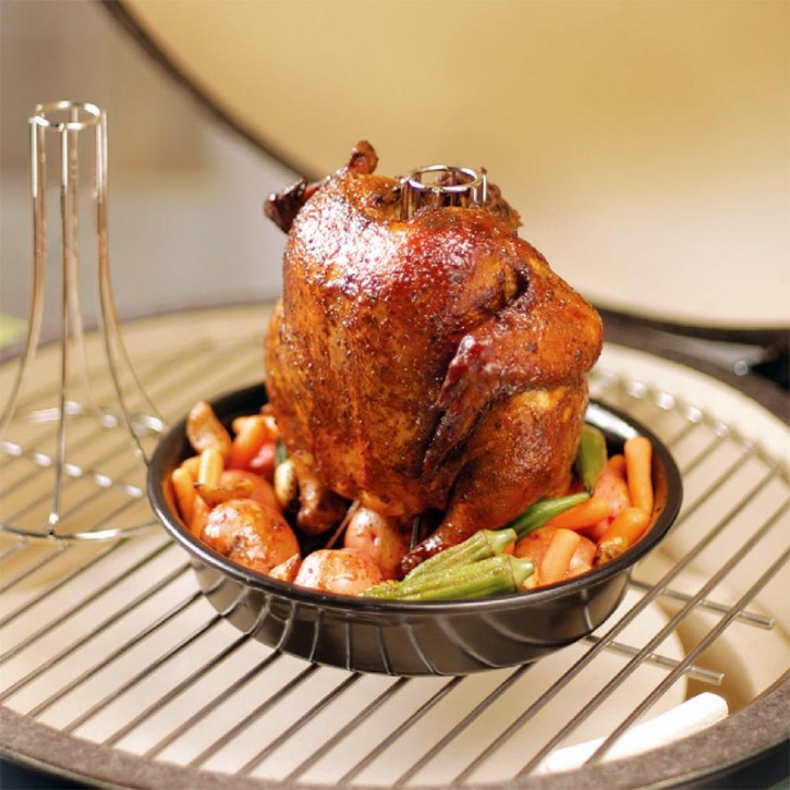 Цей багатофункціональний круглий піддон для збору жиру Big Green Egg 117403, має багато способів застосування. Він підходить для збирання жиру та інших витікаючих соків, також для створення підвищеної вологості у грилі. Круглий піддон для збору жиру Big Green Egg 117403 допоможе Вам зібрати жир і соки, що виділяються під час смаження, запобігаючи їх попаданню на вугілля або convEGGtor. Його можна використовувати з вертикальними підставками для птиці, або V-подібними гратами, або з різними стійками для м'яса - це чудова можливість приготувати овочі в соку курки, індички, свинини. Його можна наповнити невеликою кількістю води, вологість повітря в EGG підвищиться, і страва вийде ще соковитішою. Ще його можна використовувати як ємність для підігріву рідини. Завдяки антипригарному покриттю, яке робить чищення простим, піддон для крапель також можна використовувати як форму для випікання пирогів.