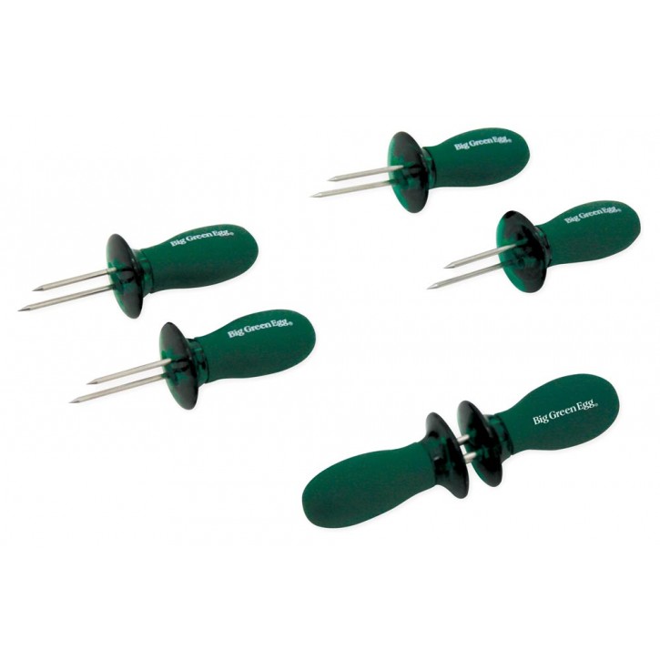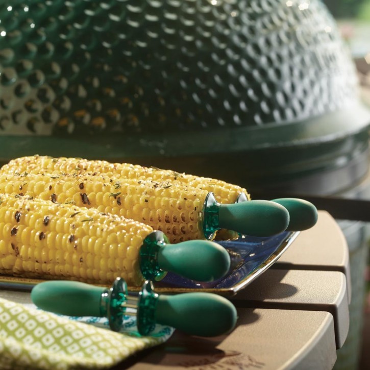Винахід, якого всі так довго чекали: тримачі для кукурудзи Big Green Egg 117335, за допомогою яких можна їсти гарячі качани, не обпалюючись. Тримач для кукурудзи має дві спиці з нержавіючої сталі та м'яку ручку, завдяки якій качан зручно тримати в руках, а пальці залишаються чистими. Якщо Ваші діти мають поганий апетит, наріжте шматочками будь-який продукт і дайте їм цю імпровізовану вилочку. Або зробіть за допомогою цього аксесуара чудові канапешки. Радість у чистому вигляді. У комплекті 4 пари. (8 шт.)