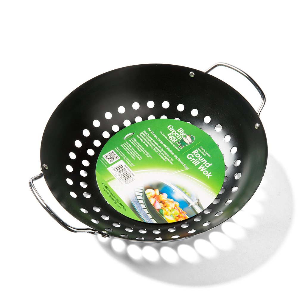 Круглий сталевий вок Big Green Egg 002068, діаметром 28 см з антипригарним фарфоровим покриттям, на якому можна готувати страви з використанням мінімальної кількості олії. Дозволяє легко просмажувати невеликі шматочки м'яса, овочі, морепродукти, які можуть прослизнути через звичайні грати гриля, а перфорація (отвори) у вічі забезпечують ефективну циркуляцію тепла, що надає продуктам характерного для Big Green Egg смаку та забезпечує їх рівномірне приготування.