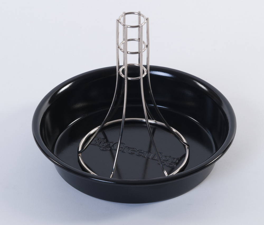 Хромована сталева підставка Big Green Egg 117458, утримуватиме птицю вертикально під час приготування, що сприяє кращому підрум'янюванню. Коли вона буде готова, її зручно обробляти не знімаючи з підставки. За допомогою металевого вертикального утримувача дуже просто приготувати ідеально засмажену птицю. Сік залишається всередині, тому що м'ясо птиці зволожується її власним жиром, завдяки вертикальному положенню, посилюючи аромат і перетворюючи шкіру на хрумку скоринку. Для запобігання попаданню жиру на вугілля, найкраще встановлювати утримувач для птиці на круглий піддон для збирання крапель.
