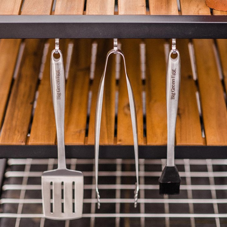 Ви можете розширити робочу зону завдяки модульній системі EGG Workspace. Рейка Big Green Egg 120281 BBQ Tool Hooks з трьома гачками для приладдя кріпиться на модулі EGG Frame. Так все Ваше приладдя буде під рукою. Для столів з акації пропонуються відповідні дерев'яні гвинти. Ідеальна для модулів Expansion Frame Big Green Egg 120236, EGG Frame Big Green Egg 120212, EGG Frame Big Green Egg 120229.