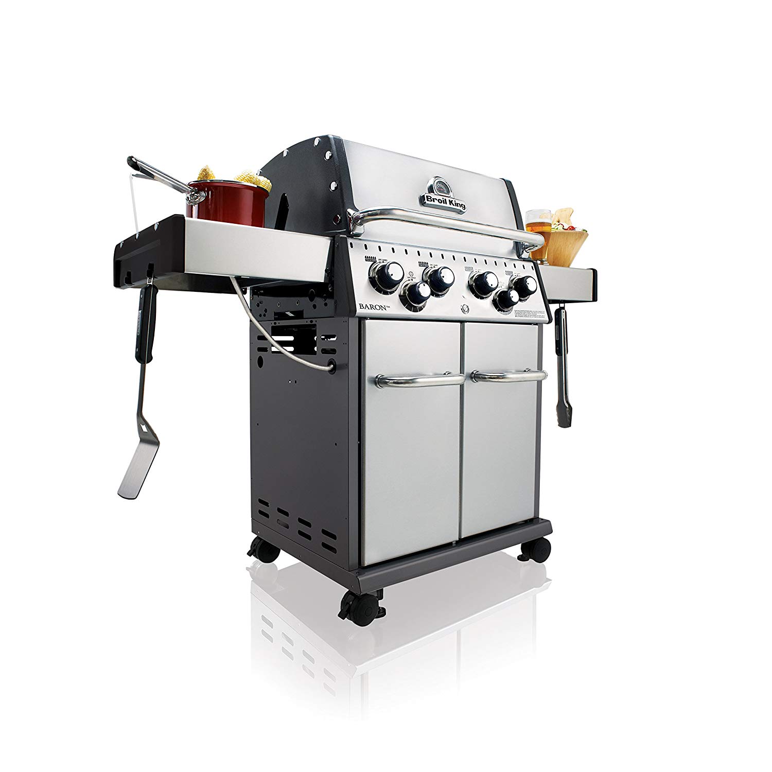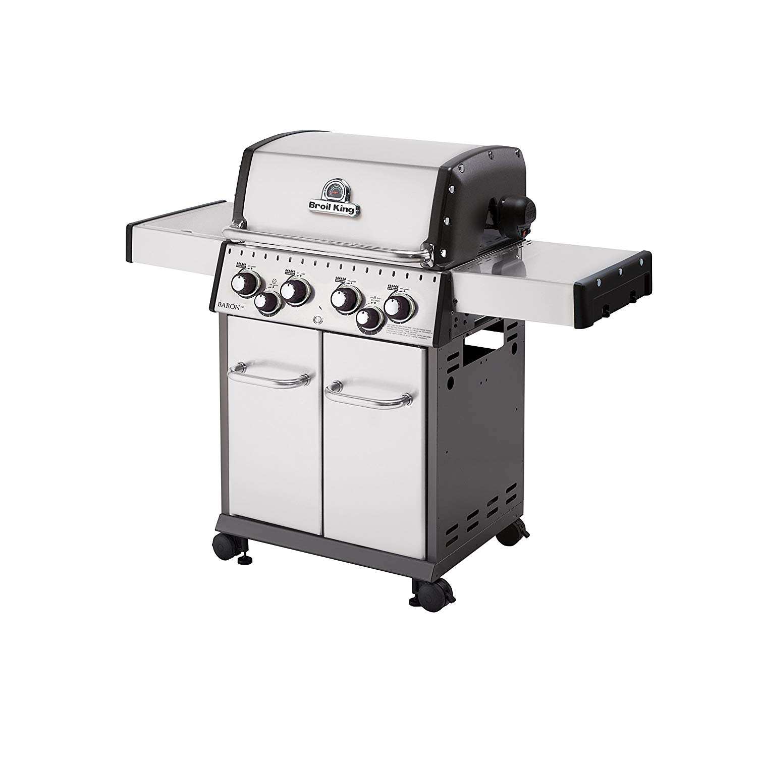 Привабливий дизайн, складні полиці, двосторонні чавунні решітки, додаткова решітка для підігріву, задній пальник і електромотор рожена, додаткова бічна конфорка, роблять гриль універсальним. Чавунні решітки, загальним розміром 65 × 44 см., 4 потужних пальника Dual-Tube, додаткова конфорка в лівій полиці потужністю 2,7 кВт дозволять готувати для великої компанії і зроблять гриль Broil King® Baron™ 490S приємним доповненням Вашого саду.