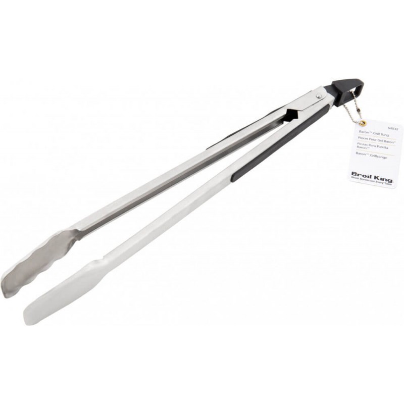 Щипці для гриля Broil King® Baron™ 64032, володіють відмінним дизайном, здатним задовольнити навіть найвибагливішого кухаря, і поєднують у собі функції лопатки та міцних щипців для захоплення та підйому продуктів. Блокуючий механізм також є гачком для підвішування. Вони зроблені з нержавіючої сталі, і мають силіконові протиковзкі вставки на ручці - ідеальне поєднання практичності та міцності. З їхньою допомогою Ви миттєво покладете, перевернете або дістанете приготовані страви. Вам не доведеться метушитися і турбуватися про те, що щось може впасти.