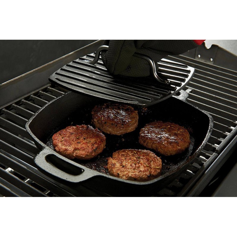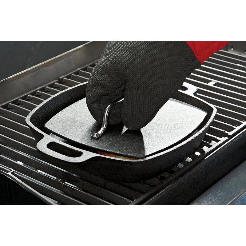 Чавунна сковорода Broil King 91658, дуже міцна та універсальна, з двома бічними практичними ручками, однаково добре реагує на приготування швидких та довгих страв. Ця універсальна чавунна сковорода може витримувати дуже високі температури і забезпечує ідеальний і рівномірний розподіл тепла, що дозволить Вам швидко обсмажити м'ясо або, навпаки, томити або гасити протягом декількох годин, приготувати індонезійський ренданг, гратен або запіканку з картоплі. А якщо в тандемі використовувати прес чавунний Broil King 91659, то і соковитий стейк, тепер під силу кожному. Після використання потрібно тільки помити в гарячій воді і трохи змастити олією. Сковороду не можна мити в посудомийній машині.
