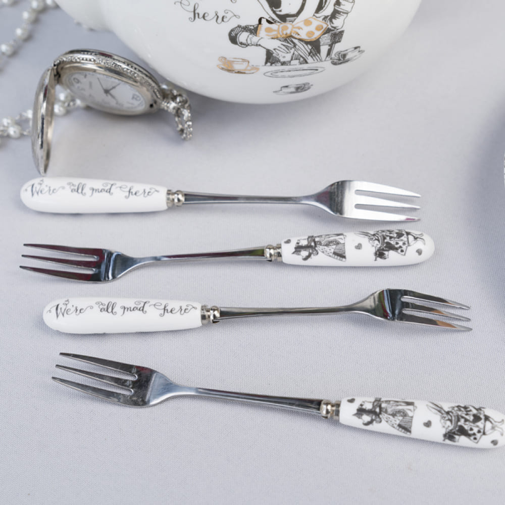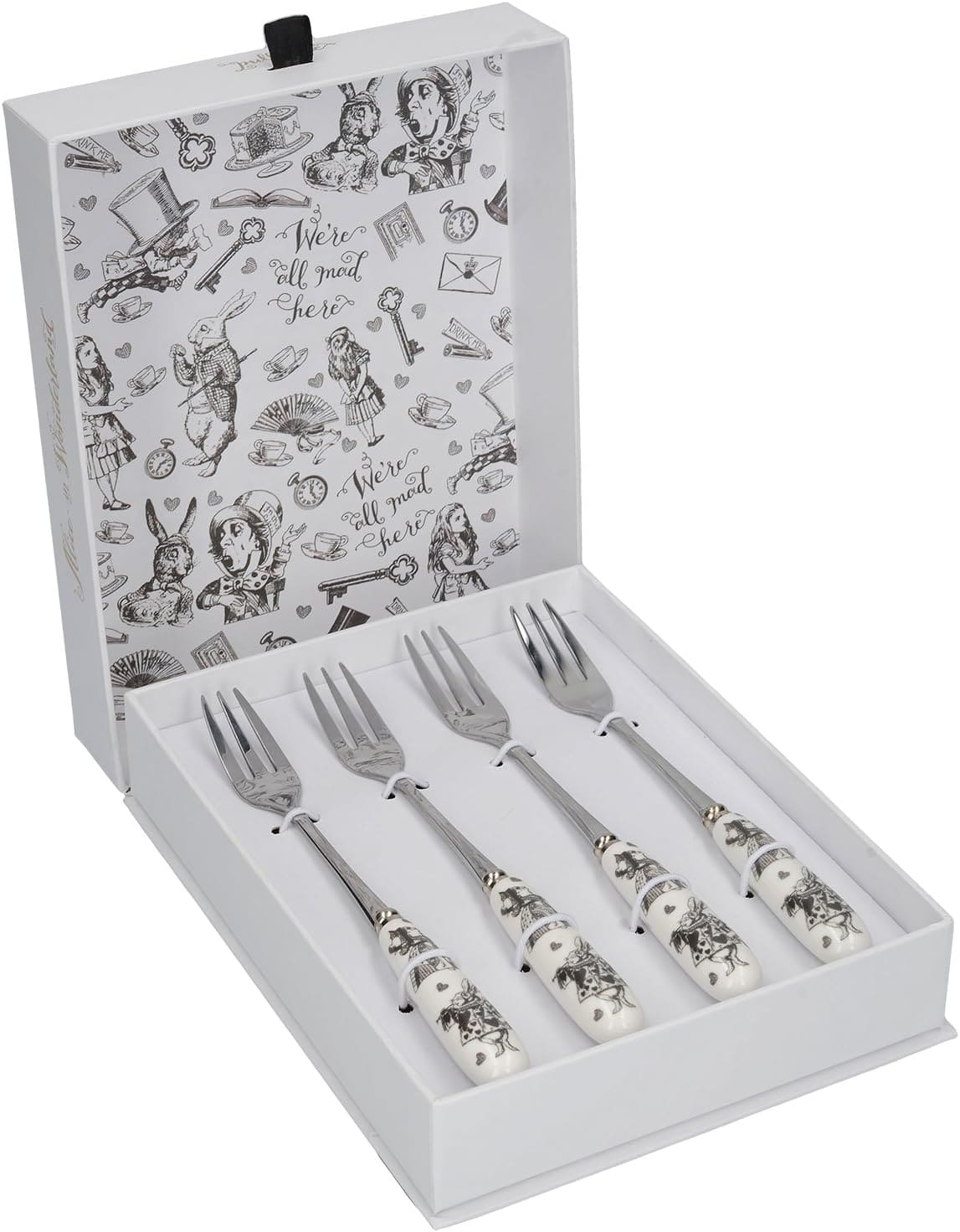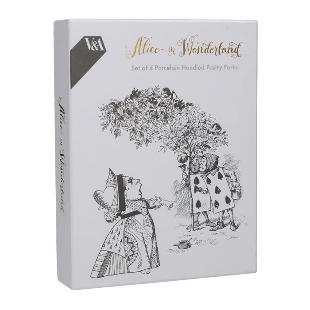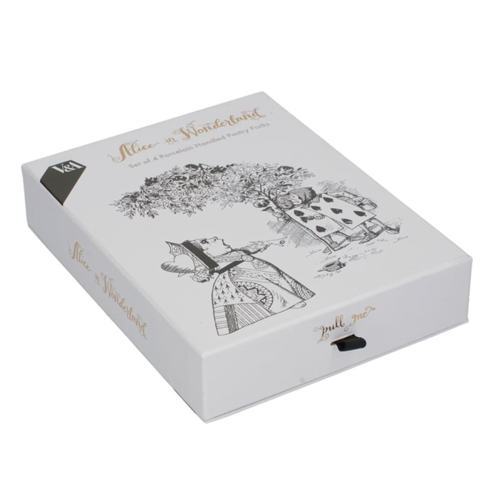 Пориньте у світ прекрасного разом з вилками для десерту CreativeTops VA5227081, виготовлених з нержавіючої сталі з фарфоровими ручками, на яких ілюстровані знакові персонажі з книги «Аліса в країні чудес». Вилочки будуть радувати око як у родинному колі, так і при прийомі гостей, ідеально підійдуть до колекції чашок, блюдець і тарілок Alice in Wonderland і створять атмосферу істинно аристократичного чаювання. Добре підійдуть як для щоденного використання, так і для сервірування столу. Підходять для миття в посудомийній машині. Набір десертних вилок упаковані в стильну, фірмову, подарункову коробку із зображенням сцен із казки Alice in Wonderland, а для того, щоб відкрити її, необхідно вирішити головоломку: знайдіть вкладку «Потягни мене» на стрічці і побачите сюрприз, що ховається всередині!