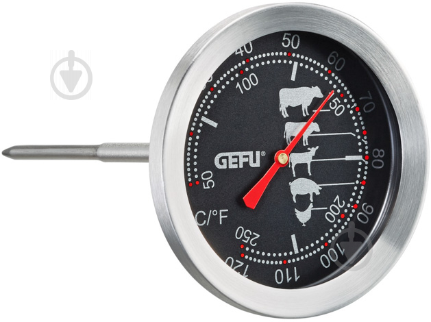 Механічний термометр GEFU Messimo 21880 - створений для того, щоб вимірювати температуру м'яса, під час його приготування на грилі, або в духовці. Ідеальний помічник на кухні для всіх любителів м'яса, барбекю та гурманів. Чи подобається вам рожевий стейк з яловичини, ніжна свиняча корейка або хрумкий домашній птах, цей термометр покаже вам ідеальну температуру приготування.