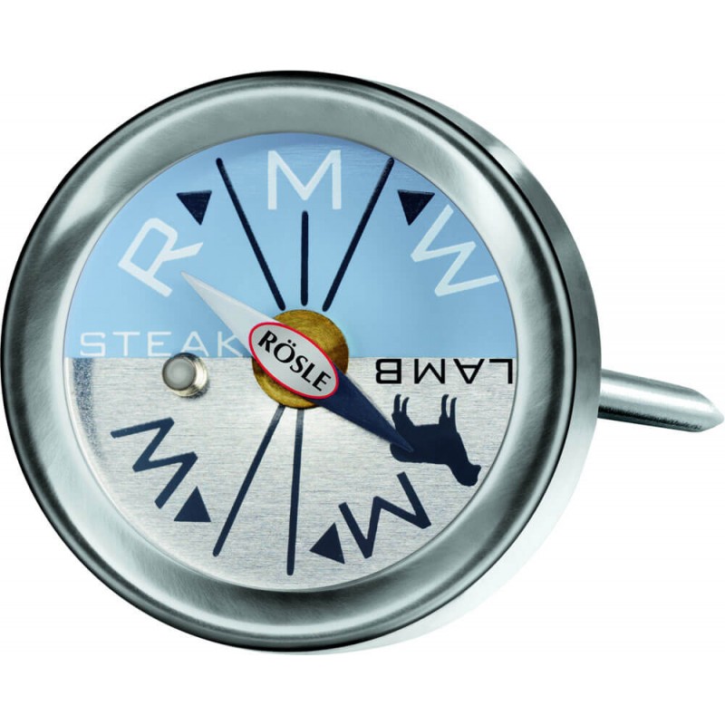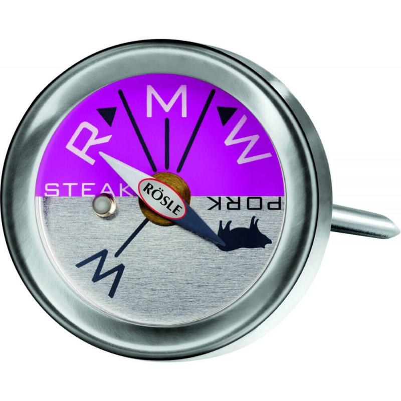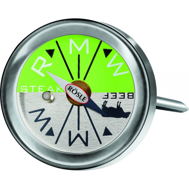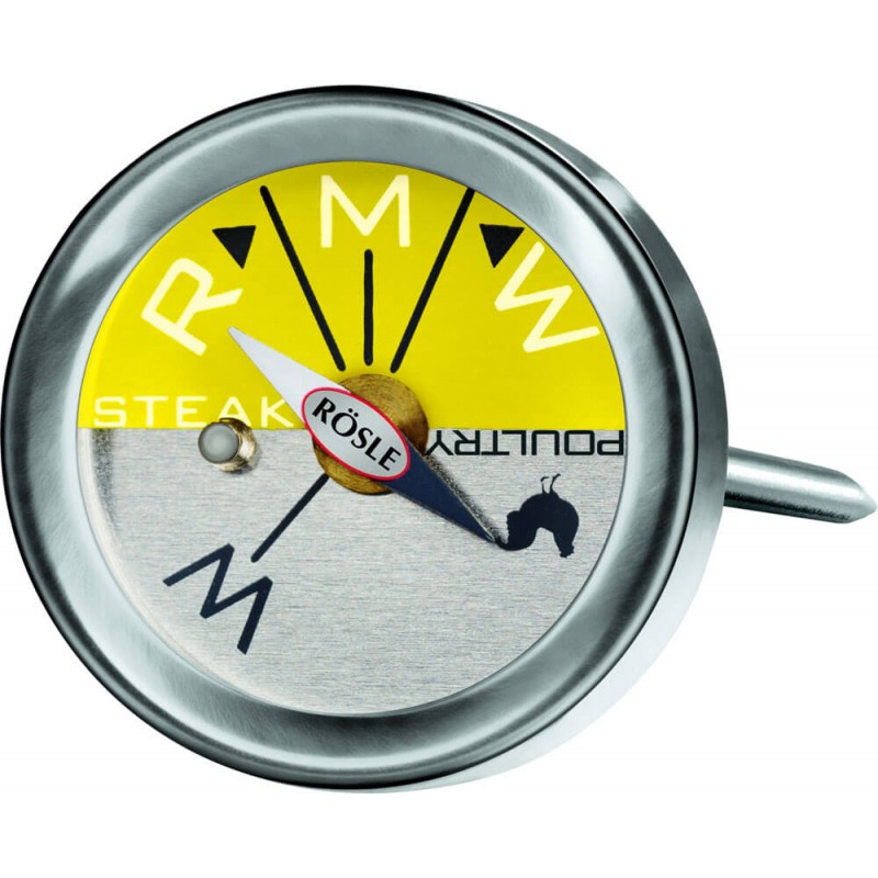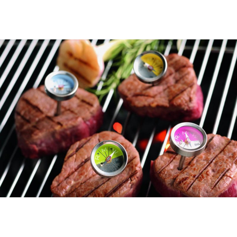 Набір з чотирьох міні-термометрів Rösle R25067. Різнобарвні термометри, кожен з яких призначений для певного виду м'яса (птиця, яловичина, баранина і свинина) Кожен термометр має дві функції: одна для смаження стейків і одна для випалювання конкретних видів м'яса. Дисплей, що легко читається. Підходить для використання на грилі, сковороді та в духовці.