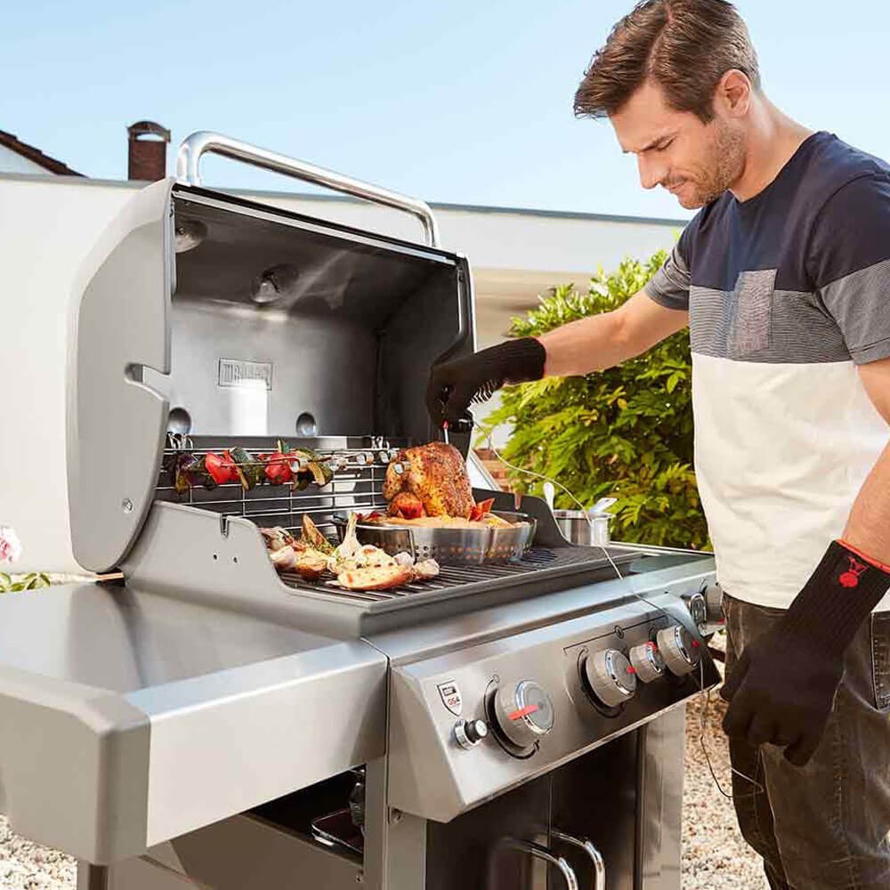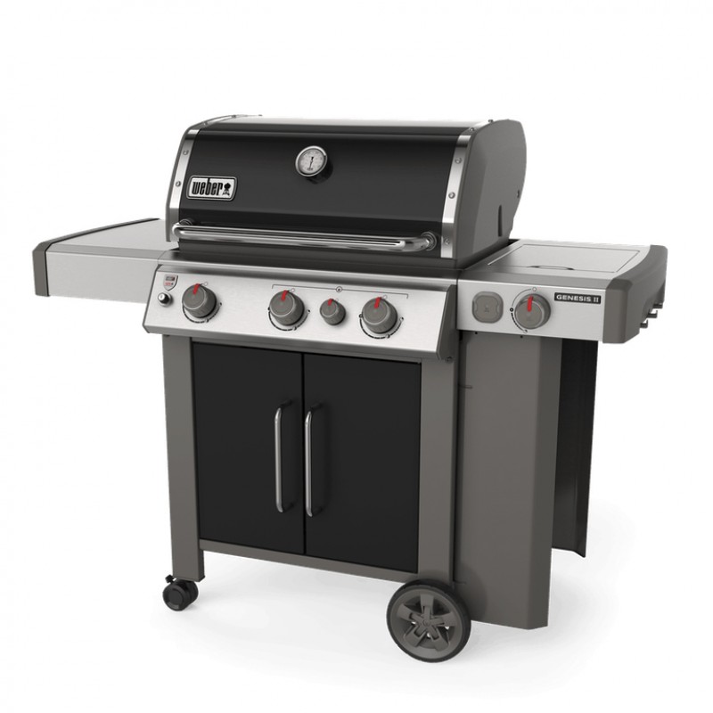 Продуктивний газовий гриль Weber Genesis II EP-335 GBS виводить процес приготування їжі на новий рівень, роблячи його справді творчим. Модель оснащується додатковим четвертим пальником з технологією Sear Station, що дозволяє готувати страви, що вимагають швидкого прожарювання (стейки). У бічний столик органічно інтегрована конфорка для варіння бульйонів, соусів. Потужні сталеві пальники мають спеціальну прямокутну форму, завдяки якій потік газу рівномірно переміщується від передньої до задньої частини. Грати особливої форми оснащуються круглим знімним сегментом, який можна дістати, помістивши на його місце різний посуд (ростер для запікання курки, казан для плову). Продумана конструкція гриля дозволяє розташувати посуд, інструменти та інші необхідні під час приготування аксесуари. Для газового балона є місце в ящику під грилем або підвіс на правій стіні.