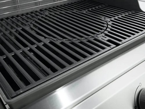Чавунні грати корисною площею 68 X 48 см, оснащені системою GBS (знімна секція круглої форми для застосування аксесуарів серії Gourmet BBQ System, що значно розширюють можливості грилінгу). Покриття з фарфорової емалі захищає решітку від корозії