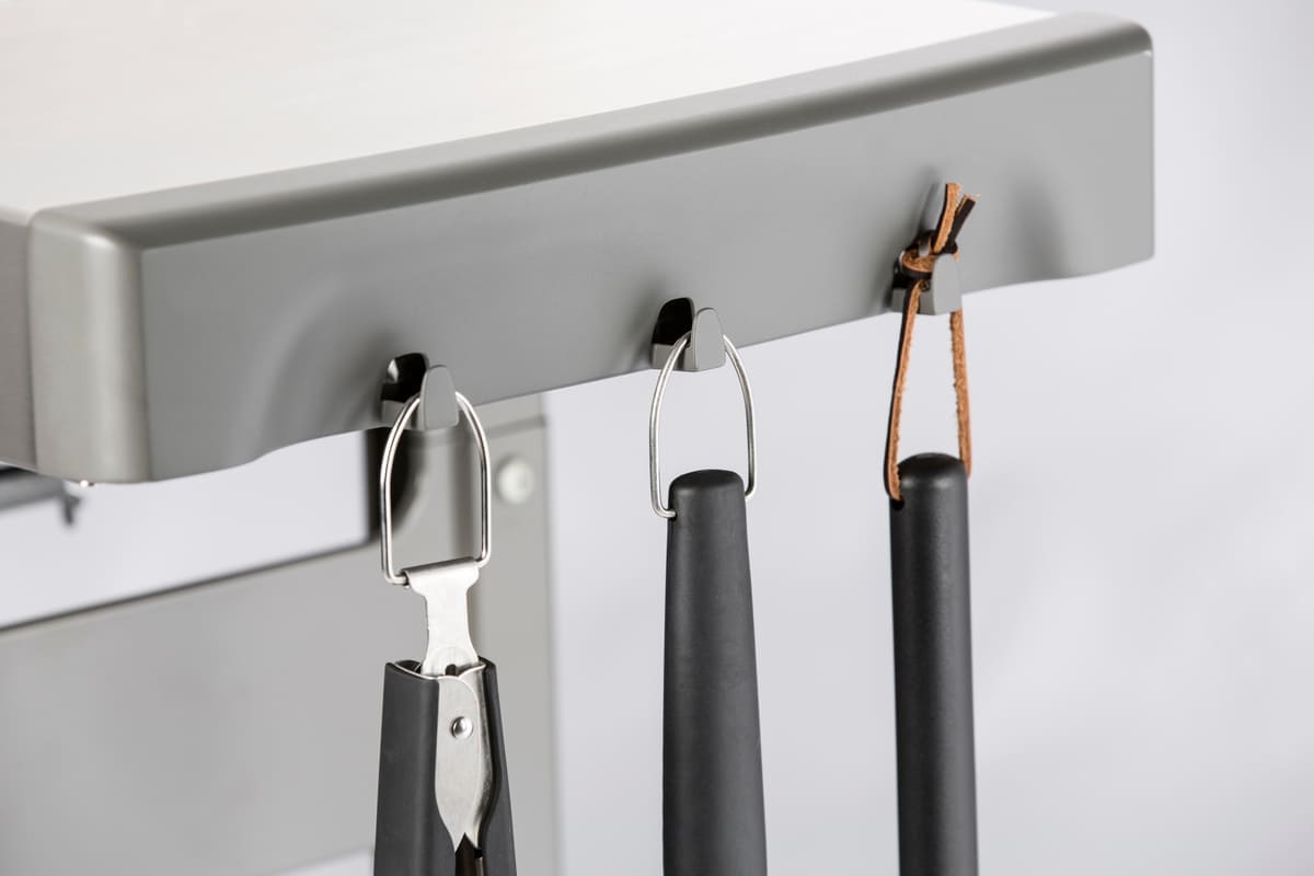 Міцні бічні полиці, обладнані гачками для інструментів. Полиці виготовлені з нержавічої сталі легко та швидко складавються для компактного зберігання гриля.