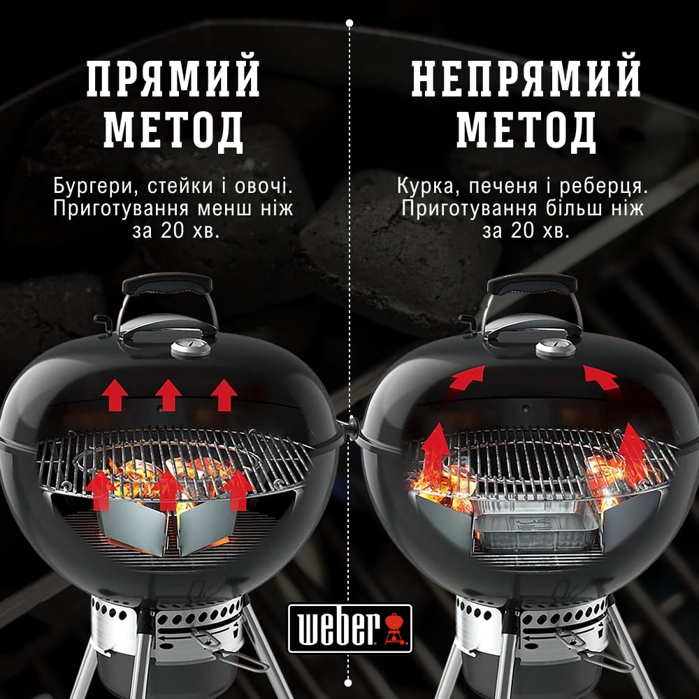 дозволяють готувати прямим та непрямим методом, тим самим розширюючи функціональні можливості гриля. Тепер ви можете приготувати все: від грилінгу стейку до запікання курки. Розташуйте лотки з вугільними брикетами в центрі решітки, щоб створити область прямого жару над ними, або рознесіть їх по краях котла, щоб використовувати непрямий метод приготування.
